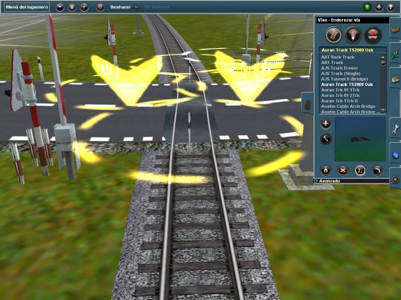 La vía es como si fuera independiente del paso a nivel, pues debería estar enredezada y no lo está en ninguno de los dos pasos a nivel, y cuando borro el paso a nivel se queda la vía y no me deja moverla ni borrarla. También, en la 2ª captura se puede ver que la carretera parece que pase por encima del paso a nivel, el "pfosten" (los indicadores reflectivos de la carretera) están en medio de la vía...