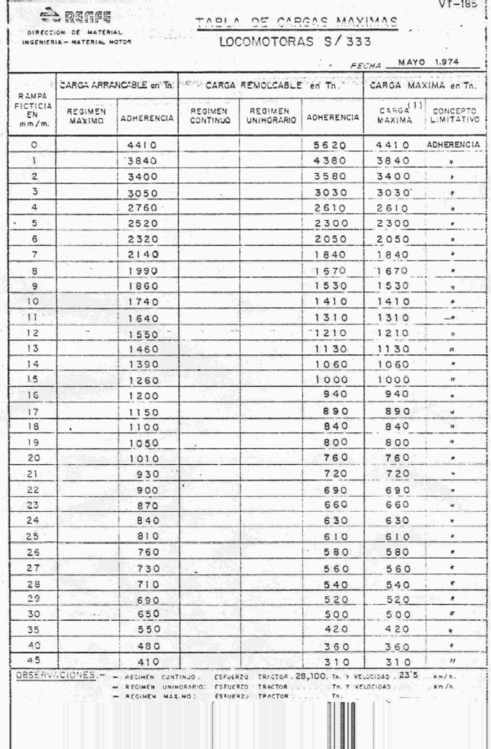 Solucionado a priori las cuestiones básicas del freno (podría escribir y no pararía en cada uno de los pormenores del mismo), es menester que sepais que para corregir la falta de esfuerzo tractor de vuestra tresmil (no confundir con potencia), es necesario un cuadro de cargas máximas de la 333 de RENFE, una ruta como la de Kevin (donde se sepan las pendientes y esté correctamente señalizadas las velocidades máximas en cada tramo) y una serie de viajes hasta que las cargas remolcadas a ciertas velocidades, se vayan pareciendo a lo que dice en "Cuadro de Cargas Máximas".