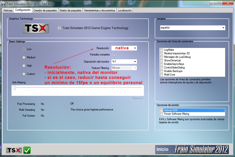 Sin luz no hay vida ni ambiente, y dado que no hay luz sin sombras, entiendo que la configuración mínima para TS2012 es aquel equilibrio en el cual aparecen sombras y conseguimos un mínimo de 15 fps o imágenes por segundo. (Ojo: el contador de fps del juego que se activa con mayúsculas+z no mide por debajo de los 15 fps, por lo que nonos sirve si se da el caso).