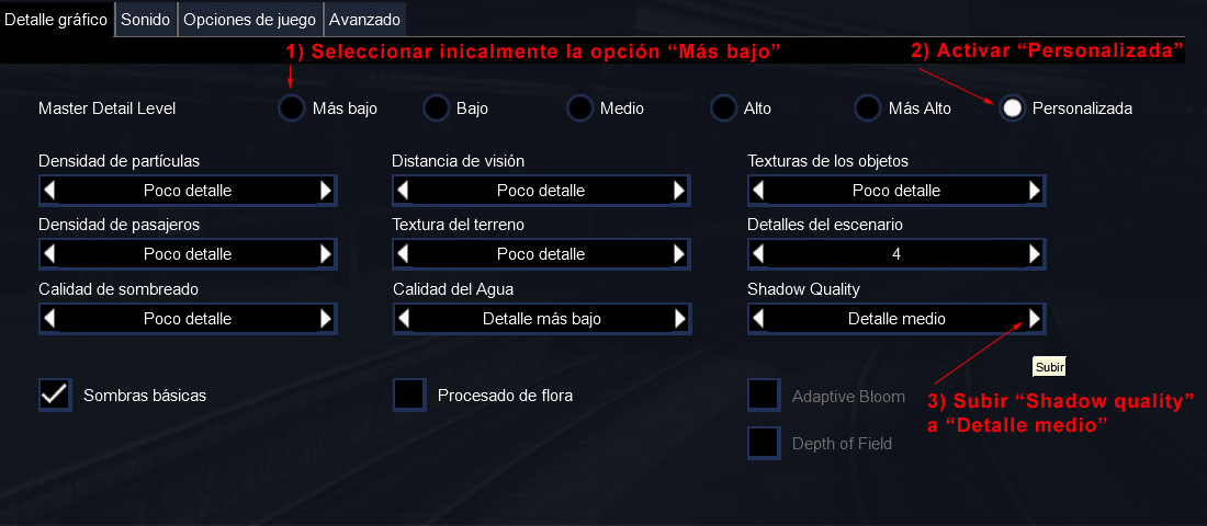 Debemos establecer la opción Más bajo pero con la opción de "Shadow quality" en Detalle medio, para que aparezcan las sombras (y la luz, y la vida en el juego):