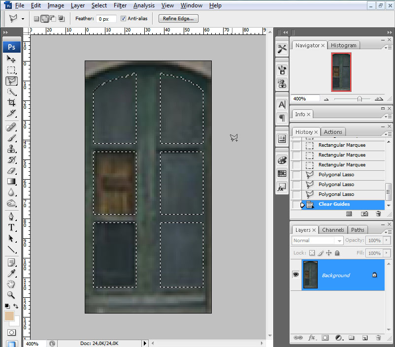 Recortaremos la ventana y crearemos una nueva imagen con ella a la que le daremos las dimensiones 128 píxeles de alto por 64 píxeles de ancho. Crearemos una selección que defina los cristales de la ventana:
