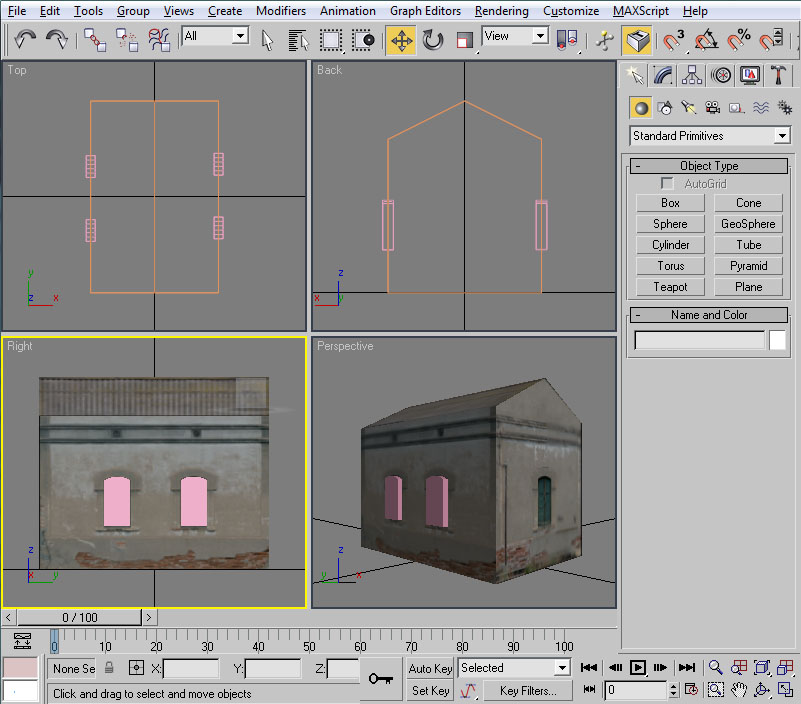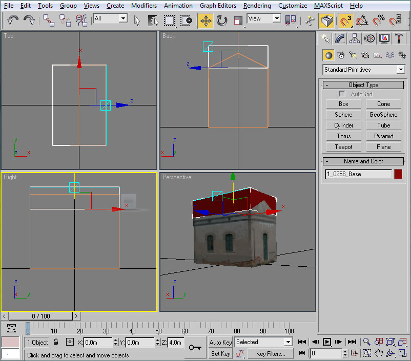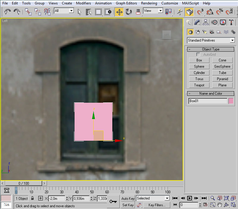 Desplazaremos el cubo hasta la posición de la ventana. Esto lo podemos hacer mediante "Select and Move" y, en la vista lateral, pinchando con el ratón sobre las dos flechas, verde y roja, que aparecen sobre el "pivot" del cubo.