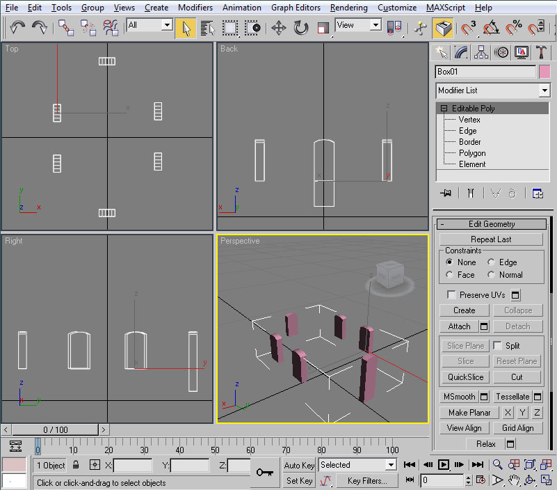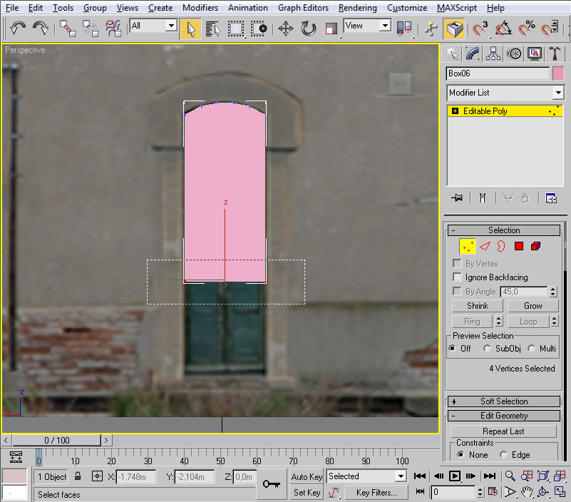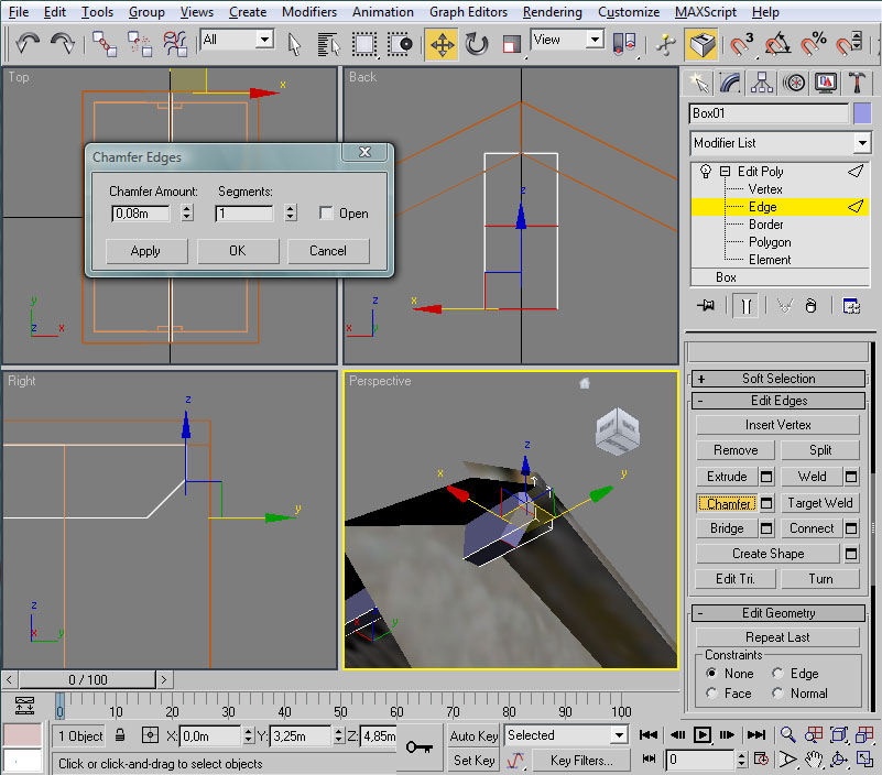 Iremos a la vista en perspectiva, donde centraremos la ventana y el cubo. Como éste último está situado "sobre la pared", con la casilla seleccionada pulsaremos las teclas "Alt" + "X", con el fin de volver temporalmente semi-transparente la casilla y así ver en su totalidad el cubo sobre el que vamos a trabajar. En esta situación, convertiremos el cubo en "Editable Poly", pasaremos a modo aristas ("Edge") y seleccionaremos, de las aristas superiores, las anterior y posterior respecto al lado largo del cubo (las señaladas en rojo en la imagen):