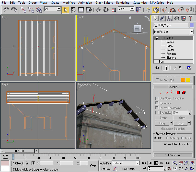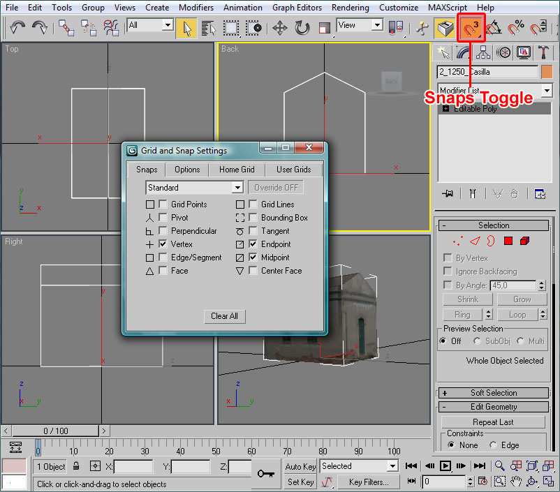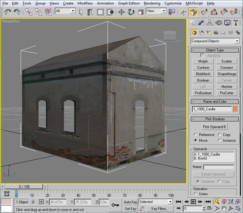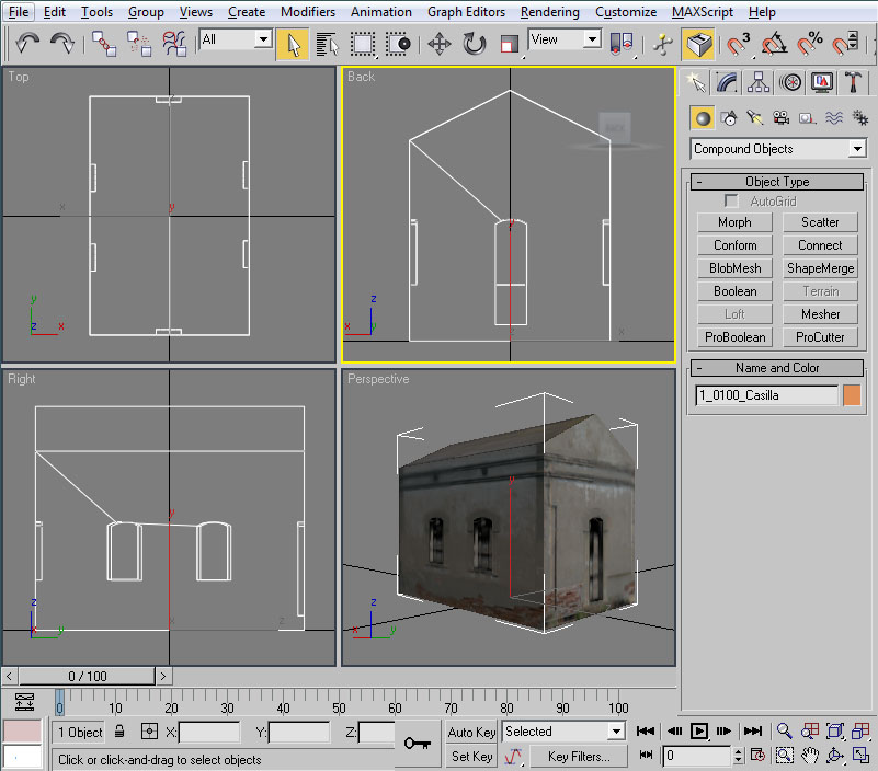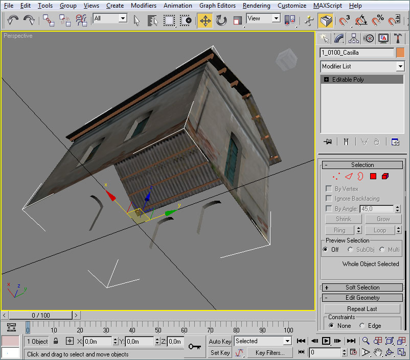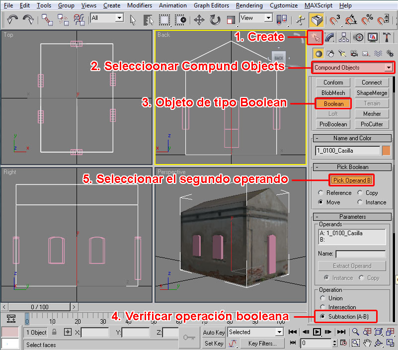 En primer lugar, como la casilla la vamos a moldear mediante operaciones booleanas para "ahuecar" ciertas partes de sus fachadas, es necesario que sea un objeto "cerrado" en su totalidad. Esto no es así porque en su momento eliminamos el polígono inferior de la casilla (como ejemplo de aligeramiento de polígonos de las piezas), por tanto, y en esta ocasión, en primer lugar deberemos volver a crear un polígono en la base de la casilla que nos "cierre" la forma geométrica de la misma.
