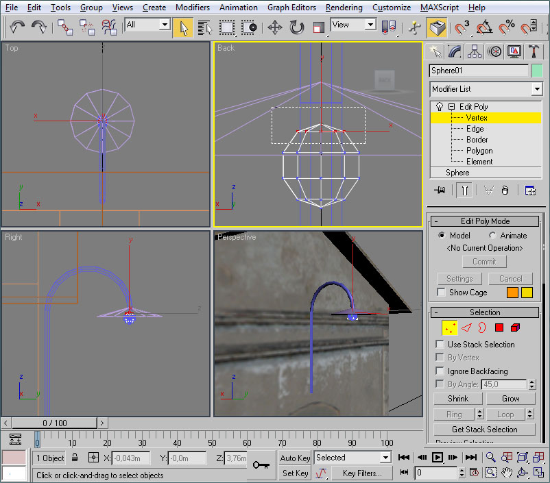 Volvemos a seleccionar el cubo y en modo de vértices ("Vertex") creamos con el ratón un área de selección que incluya todos los nuevos vértices que hemos creado:
