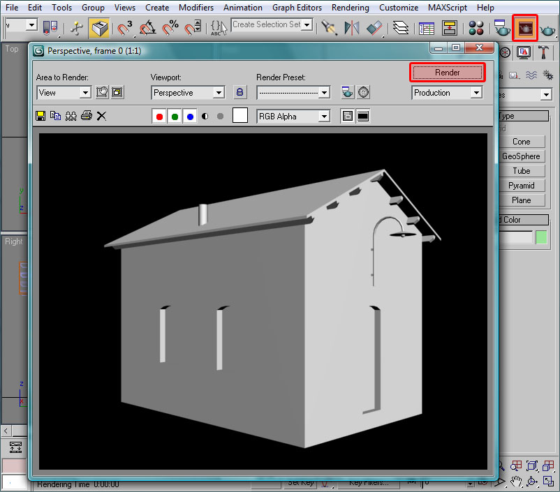 Crearemos, en la vista top, un cubo y le daremos las medidas 0,4 m. de ancho, 0,4 m. de profundidad y 0,4 m. de alto. Lo desplazaremos 2 metros hacia la fachada lateral izquierda, para que esté justo sobre ella, para lo cual bastará darle las coordenadas X=-2,0 m, Y=0,0 m y Z=0,0m.