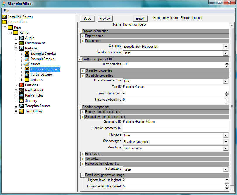 Además de los dos archivos comentados, tenemos dos archivos de texturas en la carpeta "Particles" denominados "ExampleSmoke.ace" y "fumes.ace". Como habréis deducido, son archivos con texturas del humo que podemos generar. El archivo "ExampleSmoke.ace" es para un ejemplo de humos de contenido muy simple y el "fumes.ace" viene proporcionada con RailWorks e incluye una textura más utilizable.