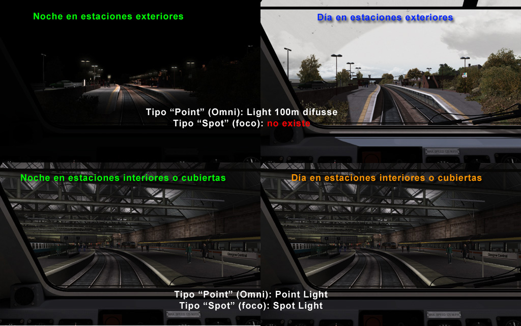 En la estación de Alcázar tengo colocada una gran cantidad de estos emisores para la iluminación de la estación y la ciudad y la caída de fps respecto al día rondará los 3-5 fps. He utilizado principalmente points lights excepto en algunos lugares donde, sin sombra propia, la luz atravesaría marquesinas iluminando todo lo que hubiese por encima suya, solucionándolo colocando emisores spot.