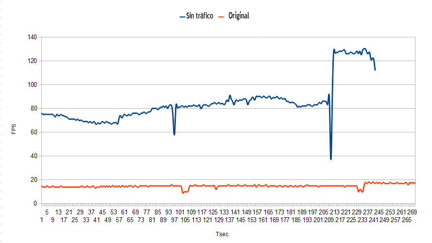 No hay sombras ni luces ni antialising. En el escenario original la media es de 15fps, mientras que sin tráfico sube hasta 85fps.