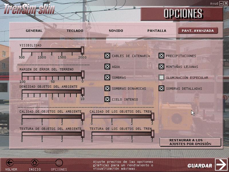 5º. Desactivé todas las opciones y fuí incrementándolas progresivamente y aquí. Al final, todas las barras están al 100% y los cables overheadwire, o algo así, activados. El resto desactivado.