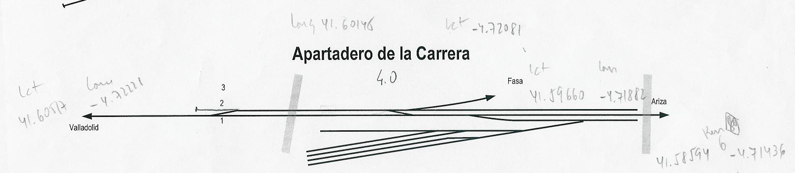 ESQUEMA DE VÍAS DEL CARGADERO DE LA CARRERA, KM 4.0 DE LA LÍNEA DE VALLADOLID-ARIZA, TAL COMO FIGURA EN LOS ESQUEMAS DE OROBON, PERO NO EN EL JUEGO.