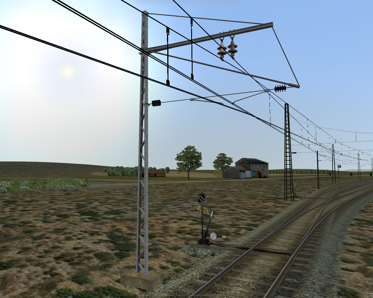 Por último, la vía incorpora, si así lo desea el creador de la ruta, catenaria de doble hilo de contacto, que irá acompañada de unos postes P2, todo ello de la compañía del Norte: