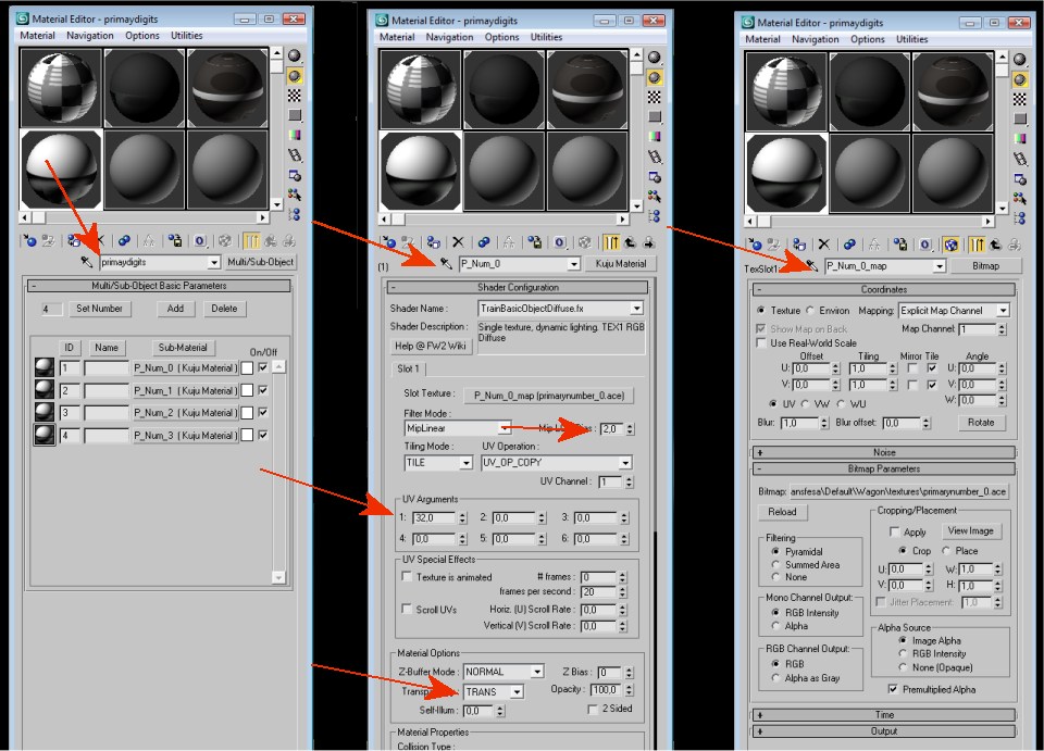 - Creo un material Multi/Sub-object con 13 submateriales, en cada uno de los cuales pongo cada uno de los ace anteriormente indicados, todos con el nombre de material primaydigits (no sé si esto es importante pero funciona) y Shader TranBasicObjectDifusse.fx (que sí que es importante). No me extiendo ahora en como se aplican submateriales, ya que es el mismo sistema que para cualquier otra aplicación de esto (con Edit Mesh, seleccionando poligono, set ID etc).
