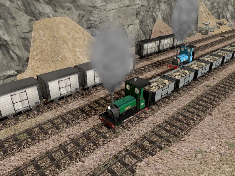Diverso material de vía estrecha (2' 3"). El paquete incluye un repintado (en primer plano) de la locomotora Britomart (en 2º plano) publicada en UK TrainSim.