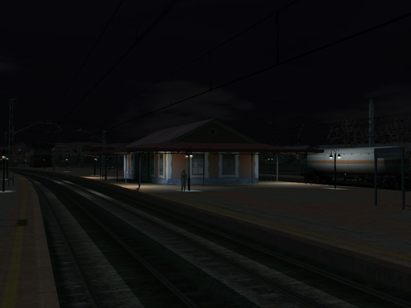 En una primera aproximación al tema he procedido a colocar unas cuantas 'farolillas' con las luces que incluye el TS2012 por defecto en el editor. A pesar de su enorme potencia y el aspecto tétrico sirvan estas capturas para mostrar el principio de lo que se podría conseguir con el nuevo motor del simulador. Habrá que investigar valores para poder hacer que esta bonita estación luzca en la noche como merece. Siento la calidad de las capturas, pero mi ordenador va muy justito y con tantas luces y tantas sombras no he conseguido moverme con soltura (1 fps cada 2 segundos es una tortura para moverse).