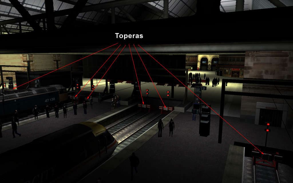 En las estaciones terminales (que se sitúan al final de una vía o varias vías) la zona de toperas se encuentra al final de cada vía, y suelen concentrarse en un mismo punto perpendicular a la vía. Es decir, dónde los trenes ya no pueden continuar. En la imagen "Toperas" la unidad está iluminando la de su vía, ya que la captura se ha tomado detrás las toperas. Siento no haber sido más explícito antes :shock: