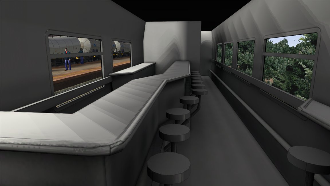 Estan ya desarrollados los coches de 1a clase, 2da clase, extremo 2da clase, furgón generador, cafeteria y restaurante, excepto los interiores que estan por 'amueblar' y texturar. El único que tiene mobiliario es el cafeteria.