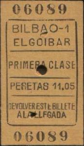 Billete aún de los Ferrocarriles Vascongados entre Bilbao y Elgoibar en primera clase.