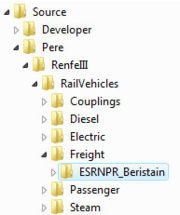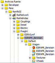 Bajo las carpetas Provider y Product deberemos crear una carpeta RailVehicles, que contendrá los diferentes trabajos de material móvil que vayamos creando. Bajo esta carpeta crearemos otra denominada Freight para los proyectos de vagones de mercancías. Hasta aquí la estructura es la estándar que determina Rail Simulator, y que podemos observar en el Provider Developer que se crea por defecto y que contiene ejemplos de diferentes tipos de Assets.