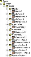 Esta nueva jerarquía tiene muchos menos grupos (son los elementos que más comen recursos en el Rail Simulator), y estos están agrupados según nuestra conveniencia para establecer los LODs del objeto. Las piezas que siempre estarán a la vista (caja, techo, etc) están directamente bajo el grupo Import que define el vagón, o sea, estarán sujetas a la distanciade visión del propio vagón. El resto de piezas están bajo diferentes grupos.