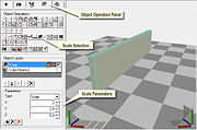 Pasaremos a dar las dimensiones deseadas a la pared de ladrillos. Una longitud de 5 metros (entre columnas), una altura de 2,5 metros y un grosor de 20 centímetos nos parecerán suficientes. Para ello abriremos el Object Operation Panel, que nos mostrará todas las herramientas que tenemos para modificación de objetos, y seleccionaremos la herramienta Scale Selection, que nos permite especificar las nuevas dimensiones del objeto. Aplicaremos los valores a los tres ejes:- X = 0,2