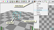 Podemos dirigirnos a la Herramienta Visible Objects, en la barra de herramientas superior, que determina de que forma se representan los objetos visibles en la escena. Se desplegará un menú contextual en el cual podemos elegir "Wireframe" para ver el cubo compuesto únicamente por sus aristas. De esta forma vemos en el centro del mismo un Gizzmo que representa el eje de la pieza, y que no debemos confundir con el centro de la escena, que también está representado por un Gizzmo en el centro del damero de la base de la escena.Seleccionaremos el cubo introducido en la escena y desplegaremos el menú contextual del grupo pulsando el botón derecho del ratón. Del menú que aparece seleccionaremos la última opción: "Properties". Se nos abrirá una ventana con las propiedades del grupo del cubo (recordemos que en Canvas los elementos no tienen propiedades, sólo las tienen el grupo del que dependen en la jerarquía). Nos interesa modificar la posición del grupo dando a los tres parámetros "X", "Y" y "Z" el valor cero. De esta forma situaremos el eje del grupo en el centro de la escena, condición necesaria para una vez generado el objeto éste se sitúe correctamente en la simulación de RS (Orientación y origen). Una vez confirmados los nuevos valores de posición del grupo observamos que el cubo aparece semienterrado en el suelo de la escena. No debemos alarmarnos pues a su debido tiempo lo remediaremos.