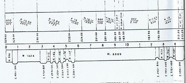 Resumimos los tramos colocados desde el cambio de entrada a Almendricos lado Águilas, con la siguiente notación —que utilizaremos en adelante— De los tramos rectos se pondrá el primero y los siguientes se citarán por su número en metros, y entre paréntesis la pendiente cuando se produzca una variación; si no, se entiende que todos los sucesivos van a la misma pendiente y por lo tanto tienen la misma elevación. Para los tramos curvos se citará el radio “r” y los grados “d” (degrees en Inglés).