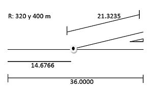 En este esquema podemos observar las dimensiones que posee el desvío de tangente 0.09. Se trata de un desvío con dos radios de curva desde el inicio de la curva al corazón, de 320 y 400 metros respectivamente, y una longitud total desde la aguja al corazón de 36 metros. En RS podríamos reproducir estas características de doble radio pero trabajar en medidas tan pequeñas ajustando radios es complicado y precisa de mucho pulso, por lo que la solución que tomaremos será la siguiente.