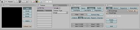 Las texturas en Blender van por referencia a un nombre asignado. Por defecto es Tex, pero se pueden nombrar a gusto del usuario. En el diálogo que se muestra se puede seleccionar el modo de texturado y la afectación que tiene sobre el modelo 3D. Las opciones de texturado a modo de pegatina es seleccionar la textura como una imagen. Las demás opciones son por defecto y son las que funcionan.