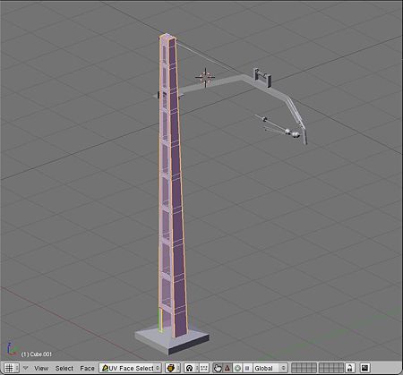 Una vez seleccionado el tipo de ventana, en la principal, en tipo 3D View, usamos el modo UV Face Select. El hecho de seleccionar una cara nos servirá de referencia en el momento de hacer el desplegado, ya que nos indicará de que cara se trata. Es importante que seleccionemos la cara UV con el ratón y seleccionemos todas las demás caras del objeto pulsando <A> dos veces.